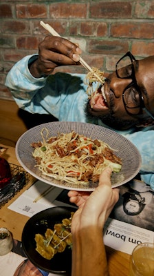 wagamama kitchen with chefs cookingwoman using chopsticks to each ramen noodles